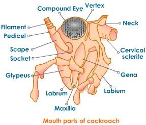 To understand the position of the mouth parts, observe the external features of a cockroach in the diagram below.